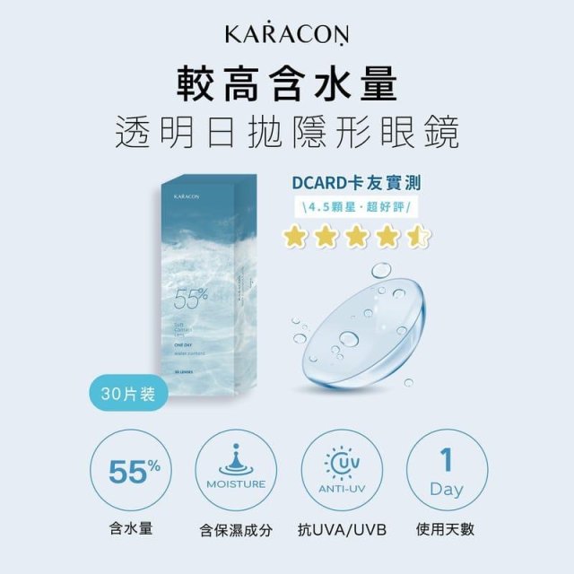 [高含水55%] Karacon - 1 Day | 三十片裝 | 台灣品牌 | 高含水防UV/UVB | Pre-order